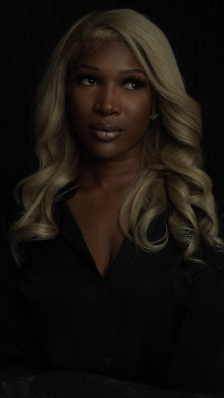 This wig is made using about 3-4 bundles of 613 hair along with a 4x4 closure to achieve maximum fullness we then toned to perfection to match her beautiful skin tone .
